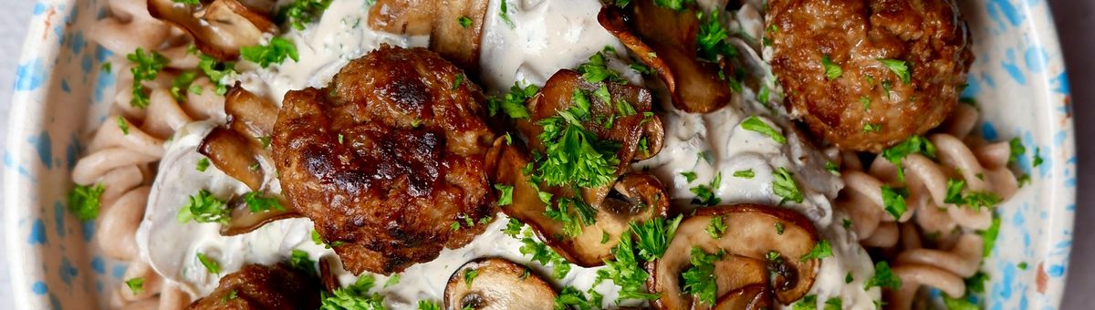 Arrange the vegan meatballs on plates along with the pasta and the mushroom cream sauce. Garnish with the remaining parsley, the reserved mushrooms and the pickled onions.