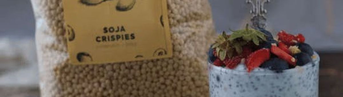 Spread the rest of the yogurt on top and layer the soy crispies, strawberries and blueberries on top again.