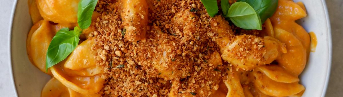 Mélanger les pâtes dans la sauce et garnir de chapelure et de basilic frais.