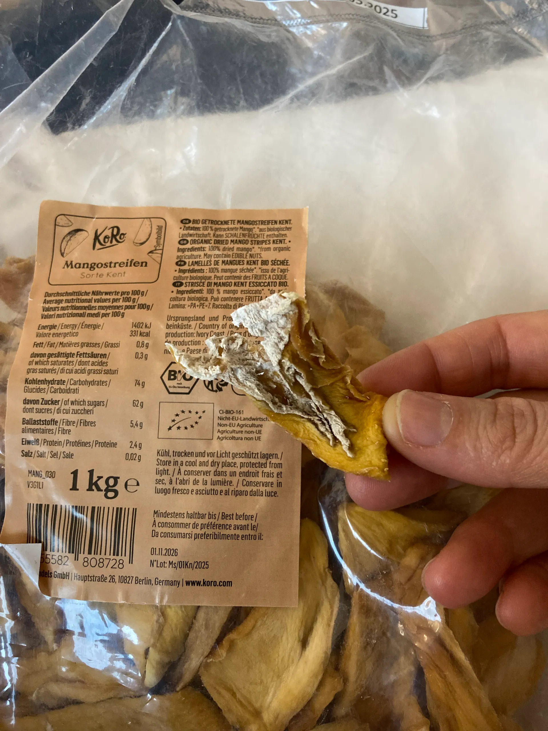 Merci pour votre commentaire ! Nous sommes vraiment désolés d'apprendre que vous avez eu cette expérience avec les lamelles de mangue. Comme indiqué sur notre site web, la taille, la couleur et le goût peuvent varier naturellement, mais il ne devrait bien sûr jamais y avoir de moisissure. Nous comprenons tout à fait à quel point il est frustrant de constater que la qualité semble inégale au fil du temps. Veuillez contacter notre service client via la rubrique « Aide » afin que nous puissions examiner votre cas. Nous espérons que vous trouverez bientôt sur notre site web un en-cas qui correspondra mieux à vos goûts.