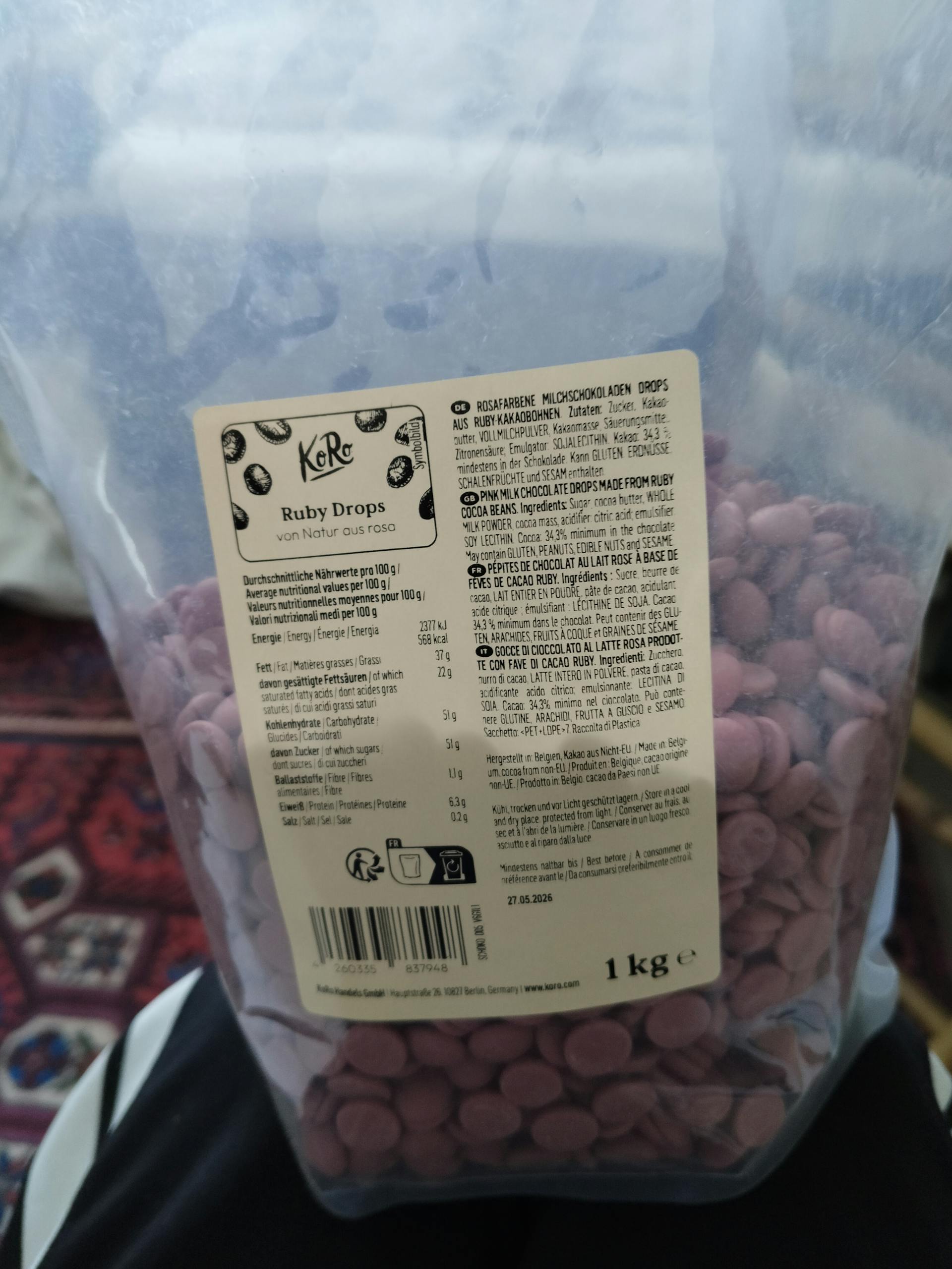 | Verkehrsbezeichnung | Rosafarbene Milchschokoladen Drops aus Ruby-Kakaobohnen |